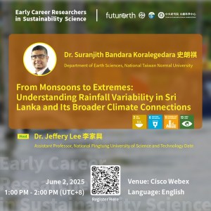 - [2025 ECR in Sustainability] From Monsoons to Extremes: Understanding Rainfall Variability in Sri Lanka and Its Broader Climate Connections2nd June 2025 13:00 – 14:00 (UTC+8); 🔱2025 第6場 ECR 線上短講 —本次主題將聚焦於斯里蘭卡的降雨變異,討論季風模式的變化及聖嬰現象與熱帶季內震盪所造成的交互影響➠ 歡迎對氣候科學與區域韌性有興趣的朋友加入我們的對話! >>https://pse.is/7ks6zp