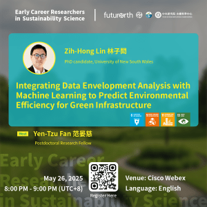 - [2025 ECR in Sustainability] Integrating Data Envelopment Analysis with Machine Learning to Predict Environmental Efficiency for Green Infrastructure26th May 2025 20:00 – 21:00 (UTC+8); 🔱2025 第5場 ECR 線上短講 —本次主題將聚焦於環境效率預測與韌性都市規劃➠ 歡迎對綠色基礎設施與決策有興趣的朋友加入我們的對話! >> https://pse.is/7hby9z