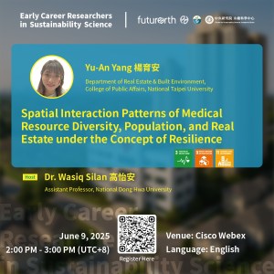 - [2025 ECR in Sustainability] Spatial Interaction Patterns of Medical Resource Diversity, Population, and Real Estate under the Concept of Resilience9th June 2025 14:00 – 15:00 (UTC+8); 🔱2025 第7場 ECR 線上短講 —本次將討論 #醫療資源分配 與 #永續都市發展➠ 歡迎對永續都市規劃議題有興趣的朋友加入我們的對話! >>https://pse.is/7lktnn
