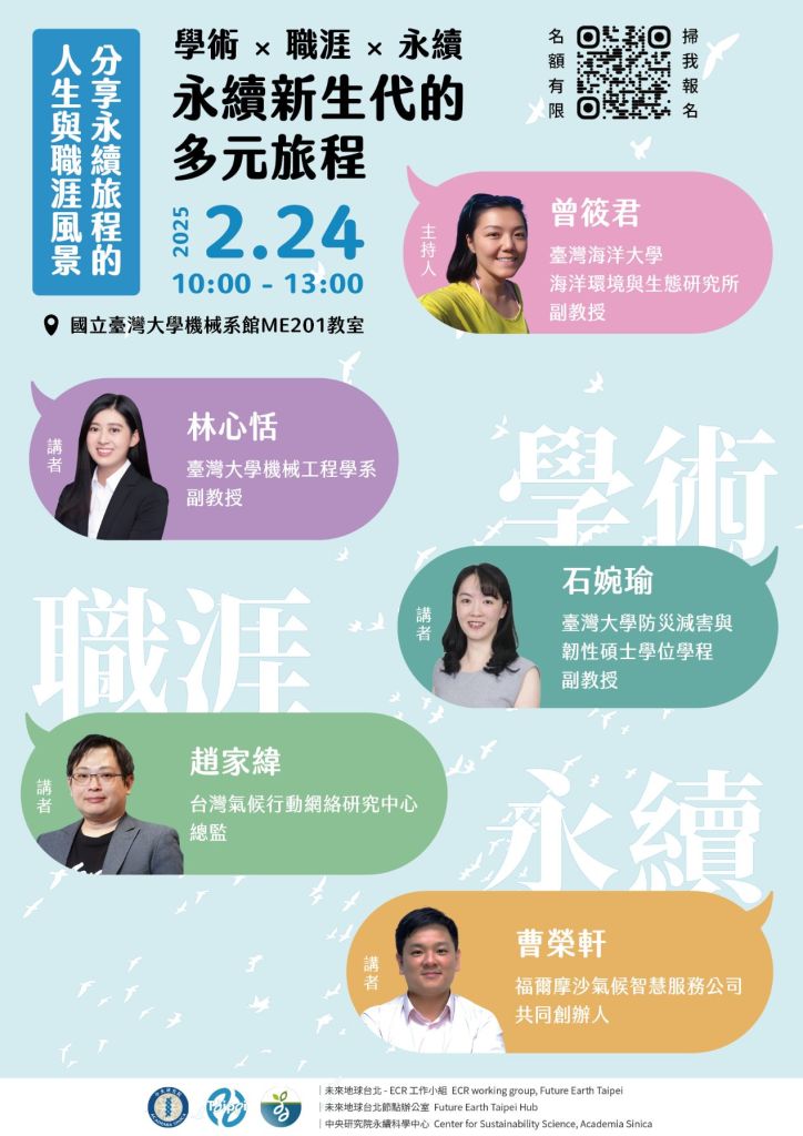 這是一場專為永續相關領域的博士生與博士後設計的輕鬆分享會!我們邀請來自學界、NGO、創業等不同領域的四位講者,分享他們的求學歷程、研究故事與職涯經驗。歡迎大家一起來參加討論與交流~